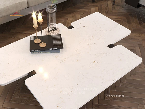Những đường vân chảy quyện vào nhau như những dòng chảy mang theo ánh ngọc trai, nhẹ nhàng chấm phá trên màu nền ngả vàng đã tạo nên vẻ đẹp sang trọng hiếm có cho sản phẩm đá Vicostone Akoya.