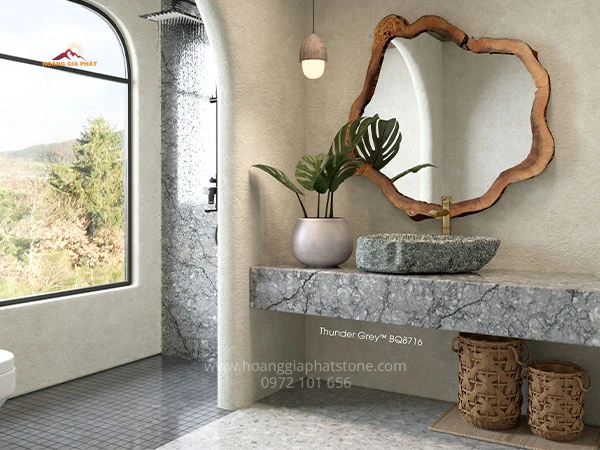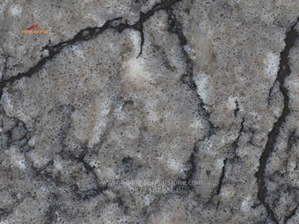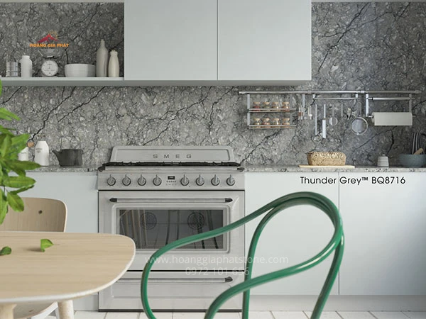 Sản phẩm đá Vicostone Thunder Grey nổi bật với những đường vân rạn, như những tia sét đánh mạnh mẽ trải dài toàn tấm. Các đường vân này càng trở nên nổi bật hơn trên bề mặt mô phỏng hiệu ứng tương tự granite (granite-looking) xám sáng phóng khoáng.