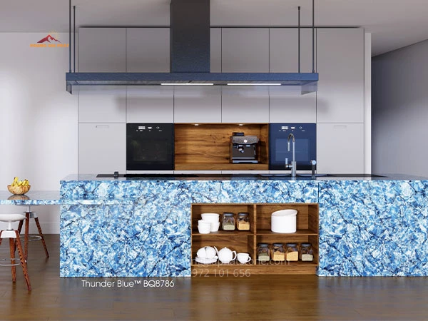 Sản phẩm đá Vicostone Thunder Blue nổi bật với những đường vân rạn, như những tia sét đánh mạnh mẽ trải dài toàn tấm. Các đường vân này càng trở nên nổi bật hơn trên bề mặt mô phỏng hiệu ứng tương tự granite (granite-looking) với màu xanh lam của đại dương.