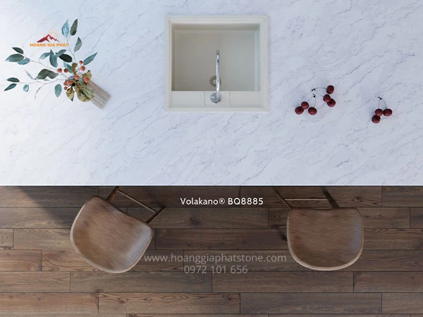Lấy cảm hứng từ dòng nham thạch đang cuồn cuộn tuôn trào như dòng nhựa sống vĩ đại của mẹ thiên nhiên đang chờ đợi được bùng cháy, tỏa sáng trên nền dung nham tưởng chừng đã nguội lạnh từ lâu, Vicostone Volakano là một thiết kế độc đáo với nền đá cẩm thạch trắng tinh khôi đi cùng hoa văn đặc biệt của vân xám nâu mạnh mẽ và thời thượng.